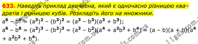 Наведіть приклад двочлена, який є одночасно різницею квадратів і різницею кубів. Розкладіть його на множники. a6 – b6 = (a3)2 – (b3)2 = (a3 – b3)(a3 + b3); a6 – b6 = (a2)3 – (b2)3 = (a2 – b2)(a4 + a2b2 + b4) = (a – b)(a + b)(a4 + a2b2 + b4).