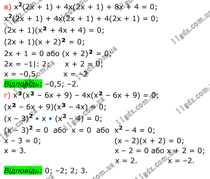 в) х2(2х + 1) + 4х(2х + 1) + 8х + 4 = 0; х2(2х + 1) + 4х(2х + 1) + 4(2х + 1) = 0; (2x + 1)(x² + 4x + 4) = 0; (2x + 1)(x + 2)² = 0; 2x + 1 = 0 або (x + 2)² = 0; 2x = –1|: 2; x + 2 = 0; x = –0,5. x = –2 Відповідь: –0,5; –2. г) x³(x² – 6x + 9) – 4х(x² – 6x + 9) = 0; (x² – 6x + 9)(x³ – 4x) = 0; (х – 3)2 • х • (х2 – 4) = 0; (х – 3)2 = 0 або х = 0 або х2 – 4 = 0; х – 3 = 0; (х – 2)(х + 2) = 0; х = 3. x – 2 = 0 або x + 2 = 0; x = 2. x = –2. Відповідь: 0; –2; 2; 3.