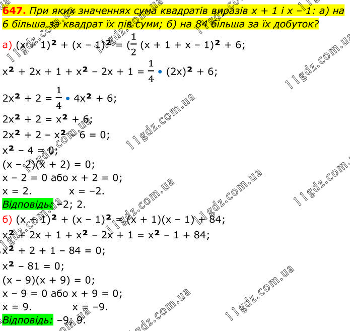 При яких значеннях сума квадратів виразів х + 1 і х – 1: а) на 6 більша за квадрат їх пів суми; б) на 84 більша за їх добуток? а) (x + 1)² + (x – 1)² = (1/2 (x + 1 + x – 1)² + 6; x² + 2x + 1 + x² – 2x + 1 = 1/4 • (2x)² + 6; 2x² + 2 = 1/4 • 4x² + 6; 2x² + 2 = x² + 6; 2x² + 2 – x² – 6 = 0; x² – 4 = 0; (x – 2)(x + 2) = 0; x – 2 = 0 або x + 2 = 0; x = 2. x = –2. Відповідь: –2; 2. б) (x + 1)² + (x – 1)² = (x + 1)(x – 1) + 84; x² + 2x + 1 + x² – 2x + 1 = x² – 1 + 84; x² + 2 + 1 – 84 = 0; x² – 81 = 0; (x – 9)(x + 9) = 0; x – 9 = 0 або x + 9 = 0; x = 9. x = –9. Відповідь: –9; 9.