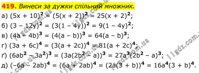 Винеси за дужки спільний множник. a) (5x + 10)2 = (5(x + 2))2 = 25(x + 2)2; б) (3 – 12y)2 = (3(1 – 4y))2 = 9(1 – 4y)2; в) (4a – 4b)3 = (4(a – b))3 = 64(a – b)3; г) (3a + 6c)4 = (3(a + 2c))4 = 81(a + 2c)4; ґ) (6ab2 – 3a2)3 = (3a(2b2 – a))3 = 27a3(2b2 – a)3; д) (–6a – 2ab)4 = (6a + 2ab)4 = (2a(3 + b))4 = 16a4(3 + b)4.
