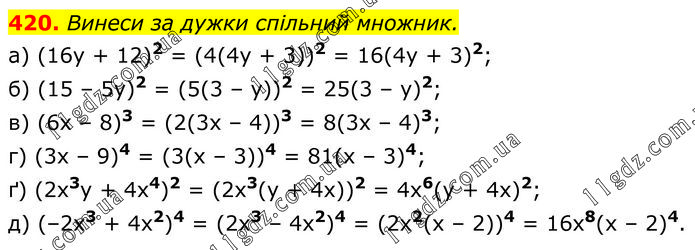 Винеси за дужки спільний множник. a) (16y + 12)2 = (4(4y + 3))2 = 16(4y + 3)2; б) (15 – 5y)2 = (5(3 – y))2 = 25(3 – y)2; в) (6x – 8)3 = (2(3x – 4))3 = 8(3x – 4)3; г) (3x – 9)4 = (3(x – 3))4 = 81(x – 3)4; ґ) (2x3y + 4x4)2 = (2x3(y + 4x))2 = 4x6(y + 4x)2; д) (–2x3 + 4x2)4 = (2x3 – 4x2)4 = (2x2(x – 2))4 = 16x8(x – 2)4.