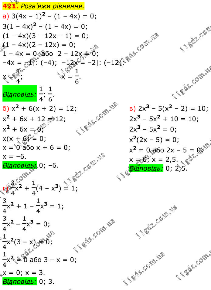 Розв’яжи рівняння. a) 3(4x – 1)2 – (1 – 4x) = 0; 3(1 – 4x)2 – (1 – 4x) = 0; (1 – 4x)(3 – 12x – 1) = 0; (1 – 4x)(2 – 12x) = 0; 1 – 4x = 0 або 2 – 12x = 0; –4x = –1|: (–4); –12x = –2|: (–12); x = 1/4; x = 1/6. Відповідь: 1/4; 1/6. б) x2 + 6(x + 2) = 12; x2 + 6x + 12 = 12; x2 + 6x = 0; x(x + 6) = 0; x = 0 або x + 6 = 0; x = –6. Відповідь: 0; –6. в) 2x3 – 5(x2 – 2) = 10; 2x3 – 5x2 + 10 = 10; 2x3 – 5x2 = 0; x2(2x – 5) = 0; x2 = 0 або 2x – 5 = 0; x = 0; x = 2,5. Відповідь: 0; 2,5. г) 3/4х2 + 1/4(4 – х3) = 1; 3/4х2 + 1 – 1/4х3 = 1; 3/4х2 – 1/4х3 = 0; 1/4х2(3 – х) = 0; 1/4х2 = 0 або 3 – х = 0; х = 0; х = 3. Відповідь: 0; 3.