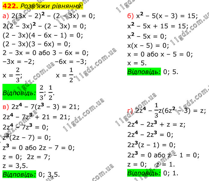 Розв’яжи рівняння. а) 2(3х – 2)2 – (2 – 3х) = 0; 2(2 – 3x)2 – (2 – 3x) = 0; (2 – 3x)(4 – 6x – 1) = 0; (2 – 3x)(3 – 6x) = 0; 2 – 3x = 0 або 3 – 6x = 0; –3x = –2; –6x = –3; x = 2/3; x = 1/2. Відповідь: 2/3; 1/2. б) x2 – 5(x – 3) = 15; x2 – 5x + 15 = 15; x2 – 5x = 0; x(x – 5) = 0; x = 0 або х – 5 = 0; х = 5. Відповідь: 0; 5. в) 2z4 – 7(z3 – 3) = 21; 2z4 – 7z3 + 21 = 21; 2z4 – 7z3 = 0; z3(2z – 7) = 0; z3 = 0 або 2z – 7 = 0; z = 0; 2z = 7; z = 3,5. Відповідь: 0; 3,5. г) 2z4 – 1/3z(6z2 – 3) = z; 2z4 – 2z3 + z = z; 2z4 – 2z3 = 0; 2z3(z – 1) = 0; 2z3 = 0 або z – 1 = 0; z = 0; z = 1. Відповідь: 0; 1.