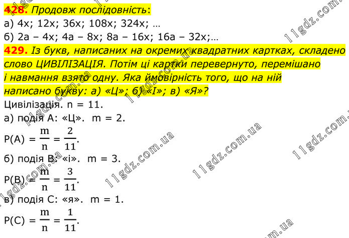 428. Продовж послідовність: a) 4x; 12x; 36x; 108x; 324x; … б) 2a – 4x; 4a – 8x; 8a – 16x; 16a – 32x;… 429. Із букв, написаних на окремих квадратних картках, складено слово ЦИВІЛІЗАЦІЯ. Потім ці картки перевернуто, перемішано і навмання взято одну. Яка ймовірність того, що на ній написано букву: а) «Ц»; б) «І»; в) «Я»? Цивілізація. n = 11. a) подія А: «Ц». m = 2. P(A) = m/n = 2/11. б) подія В: «і». m = 3. P(B) = m/n = 3/11. в) подія С: «я». m = 1. P(С) = m/n = 1/11.