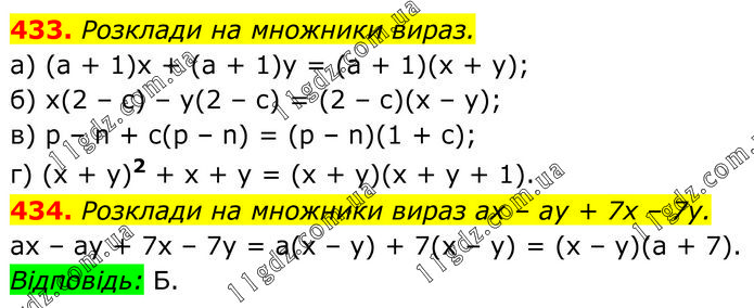433. Розклади на множники вираз. a) (a + 1)x + (a + 1)y = (a + 1)(x + y); б) х(2 – с) – у(2 – с) = (2 – с)(х – у); в) p – n + c(p – n) = (p – n)(1 + c); г) (x + y)2 + x + y = (x + y)(x + y + 1). 434. Розклади на множники вираз ах – ау + 7х – 7у. ax – ay + 7x – 7y = a(x – y) + 7(x – y) = (x – y)(a + 7). Відповідь: Б.