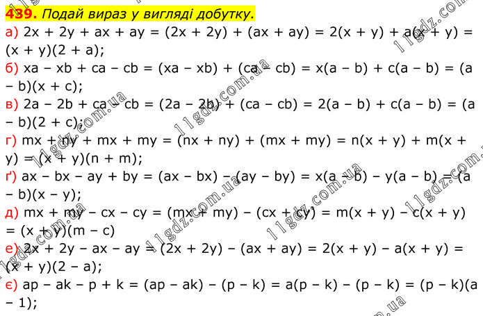 Подай вираз у вигляді добутку. a) 2x + 2y + ax + ay = (2x + 2y) + (ax + ay) = 2(x + y) + a(x + y) = (x + y)(2 + a); б) xa – xb + ca – cb = (xa – xb) + (ca – cb) = x(a – b) + c(a – b) = (a – b)(x + c); в) 2a – 2b + ca – cb = (2a – 2b) + (ca – cb) = 2(a – b) + c(a – b) = (a – b)(2 + c); г) mx + ny + mx + my = (nx + ny) + (mx + my) = n(x + y) + m(x + y) = (x + y)(n + m); ґ) ax – bx – ay + by = (ax – bx) – (ay – by) = x(a – b) – y(a – b) = (a – b)(x – y); д) mx + my – cx – cy = (mx + my) – (cx + cy) = m(x + y) – c(x + y) = (x + y)(m – c) е) 2x + 2y – ax – ay = (2x + 2y) – (ax + ay) = 2(x + y) – a(x + y) = (x + y)(2 – a); є) ap – ak – p + k = (ap – ak) – (p – k) = a(p – k) – (p – k) = (p – k)(a – 1);