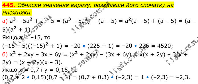 Обчисли значення виразу, розклавши його спочатку на множники. a) a3 – 5a2 + a – 5 = (a3 – 5a2) + (a – 5) = a2(a – 5) + (a – 5) = (a – 5)(a2 + 1). Якщо а = –15, то (–15 – 5)((–15)2 + 1) = –20 • (225 + 1) = –20 • 226 = 4520; б) х2 + 2ху – 3х – 6у = (х2 + 2ху) – (3х + 6у) = х(х + 2у) – 3(х + 2у) = (х + 2у)(х – 3). Якщо х = 0,7 і у = 0,15, то (0,7 + 2 • 0,15)(0,7 – 3) = (0,7 + 0,3) • (–2,3) = 1 • (–2,3) = –2,3.