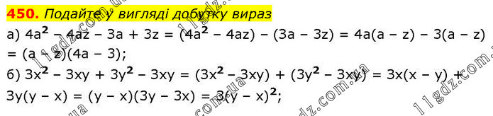 Подайте у вигляді добутку вираз а) 4а2 – 4аz – За + 3z = (4а2 – 4аz) – (За – 3z) = 4а(а – z) – 3(а – z) = (а – z)(4a – 3); б) Зx2 – Зху + 3у2 – Зхy = (Зх2 – Зху) + (3у2 – Зху) = Зх(х – у) + Зу(у – x) = (у – х)(3у – 3x) = 3(у – x)2;