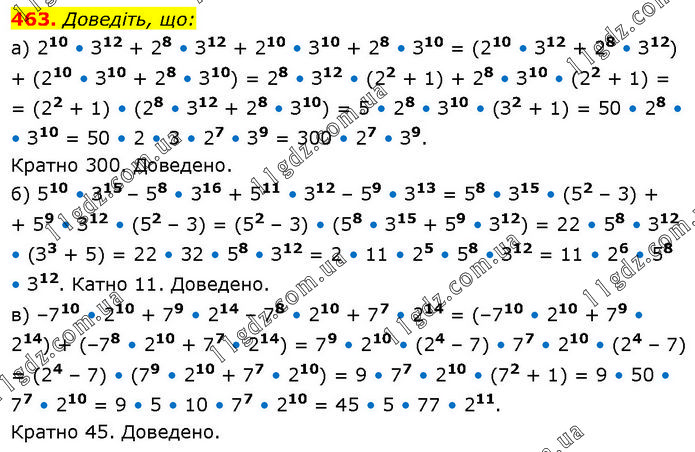 Доведіть, що: а) 210 • З12 + 28 • З12 + 210 • З10 + 28 • З10 = (210 • З12 + 28 • З12) + (210 • З10 + 28 • З10) = 28 • З12 • (22 + 1) + 28 • З10 • (22 + 1) = (22 + 1) • (28 • З12 + 28 • З10) = 5 • 28 • З10 • (З2 + 1) = 50 • 28 • З10 = 50 • 2 • 3 • 27 • З9 = 300 • 27 • З9. Кратно 300. Доведено. б) 510 • З15 – 58 • 316 + 511 • З12 – 59 • З13 = 58 • З15 • (52 – 3) + 59 • З12 • (52 – 3) = (52 – 3) • (58 • З15 + 59 • З12) = 22 • 58 • З12 • (З3 + 5) = 22 • 32 • 58 • З12 = 2 • 11 • 25 • 58 • З12 = 11 • 26 • 58 • З12. Катно 11. Доведено. в) –710 • 210 + 79 • 214 – 78 • 210 + 77 • 214 = (–710 • 210 + 79 • 214) + (–78 • 210 + 77 • 214) = 79 • 210 • (24 – 7) • 77 • 210 • (24 – 7) = (24 – 7) • (79 • 210 + 77 • 210) = 9 • 77 • 210 • (72 + 1) = 9 • 50 • 77 • 210 = 9 • 5 • 10 • 77 • 210 = 45 • 5 • 77 • 211. Кратно 45. Доведено.