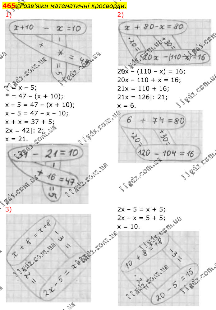 Розв’яжи математичні кросворди. 1) * = x – 5; * = 47 – (x + 10); x – 5 = 47 – (x + 10); x – 5 = 47 – x – 10; x + x = 37 + 5; 2x = 42|: 2; x = 21. 2) 20x – (110 – x) = 16; 20x – 110 + x = 16; 21x = 110 + 16; 21x = 126|: 21; x = 6. 3) 2x – 5 = x + 5; 2x – x = 5 + 5; x = 10.