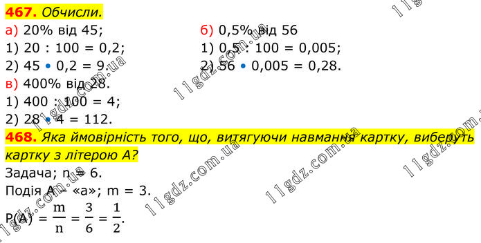 467. Обчисли. a) 20% від 45; 1) 20 : 100 = 0,2; 2) 45 • 0,2 = 9. в) 400% від 28. 1) 400 : 100 = 4; 2) 28 • 4 = 112. б) 0,5% від 56 1) 0,5 : 100 = 0,005; 2) 56 • 0,005 = 0,28. 468. Яка ймовірність того, що, витягуючи навмання картку, виберуть картку з літерою А? Задача; n = 6. Подія А – «а»; m = 3. P(A) = m/n = 3/6 = 1/2.