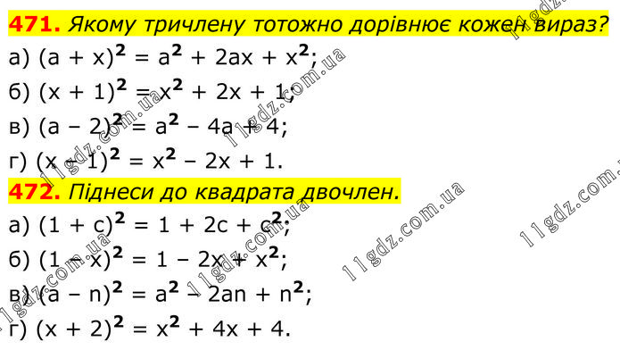 471. Якому тричлену тотожно дорівнює кожен вираз? a) (a + x)2 = a2 + 2ax + x2; б) (x + 1)2 = x2 + 2x + 1; в) (a – 2)2 = a2 – 4a + 4; г) (x – 1)2 = x2 – 2x + 1. 472. Піднеси до квадрата двочлен. a) (1 + c)2 = 1 + 2c + c2; б) (1 – x)2 = 1 – 2x + x2; в) (a – n)2 = a2 – 2an + n2; г) (x + 2)2 = x2 + 4x + 4.