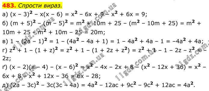 Спрости вираз. a) (x – 3)2 – x(x – 6) = x2 – 6x + 9 – x2 + 6x = 9; б) (m + 5)2 – (m – 5)2 = m2 + 10m + 25 – (m2 – 10m + 25) = m2 + 10m + 25 – m2 + 10m – 25 = 20m; в) 1 – (2a – 1)2 = 1 – (4a2 – 4a + 1) = 1 – 4a2 + 4a – 1 = –4a2 + 4a; г) z2 + 1 – (1 + z)2 = z2 + 1 – (1 + 2z + z2) = z2 + 1 – 1 – 2z – z2 = –2z; ґ) (x – 2)(x – 4) – (x – 6)2 = x2 – 4x – 2x + 8 – (x2 – 12x + 36) = x2 – 6x + 8 – x2 + 12x – 36 = 6x – 28; д) (2a – 3c)2 – 3c(3c – 4a) = 4a2 – 12ac + 9c2 – 9c2 + 12ac = 4a2.