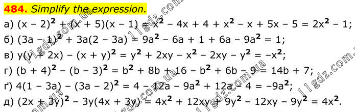 Simplify the expression. a) (x – 2)2 + (x + 5)(x – 1) = x2 – 4x + 4 + x2 – x + 5x – 5 = 2x2 – 1; б) (3a – 1)2 + 3a(2 – 3a) = 9a2 – 6a + 1 + 6a – 9a2 = 1; в) y(y + 2x) – (x + y)2 = y2 + 2xy – x2 – 2xy – y2 = –x2; г) (b + 4)2 – (b – 3)2 = b2 + 8b + 16 – b2 + 6b – 9 = 14b + 7; ґ) 4(1 – 3a) – (3a – 2)2 = 4 – 12a – 9a2 + 12a – 4 = –9a2; д) (2x + 3y)2 – 3y(4x + 3y) = 4x2 + 12xy + 9y2 – 12xy – 9y2 = 4x2.