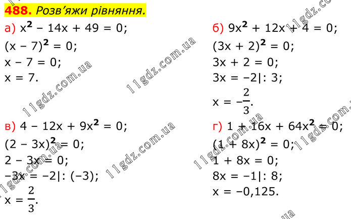 Розв’яжи рівняння. a) x2 – 14x + 49 = 0; (x – 7)2 = 0; x – 7 = 0; x = 7. в) 4 – 12x + 9x2 = 0; (2 – 3x)2 = 0; 2 – 3x = 0; –3x = –2|: (–3); x = 2/3. б) 9x2 + 12x + 4 = 0; (3x + 2)2 = 0; 3x + 2 = 0; 3x = –2|: 3; x = –2/3. г) 1 + 16x + 64x2 = 0; (1 + 8x)2 = 0; 1 + 8x = 0; 8x = –1|: 8; x = –0,125.
