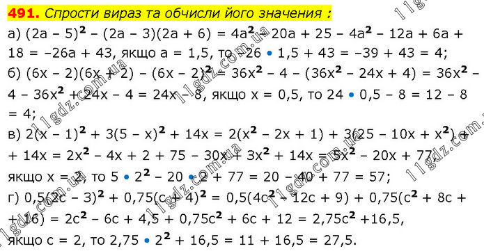 Спрости вираз та обчисли його значения : a) (2a – 5)2 – (2a – 3)(2a + 6) = 4a2 – 20a + 25 – 4a2 – 12а + 6а + 18 = –26a + 43, якщо a = 1,5, тo –26 • 1,5 + 43 = –39 + 43 = 4; б) (6x – 2)(6x + 2) – (6x – 2)2 = 36x2 – 4 – (36x2 – 24x + 4) = 36x2 – 4 – 36x2 + 24x – 4 = 24x – 8, якщо x = 0,5, то 24 • 0,5 – 8 = 12 – 8 = 4; в) 2(х – 1)2 + 3(5 – x)2 + 14x = 2(x2 – 2х + 1) + 3(25 – 10x + x2) + + 14x = 2x2 – 4x + 2 + 75 – 30x + Зx2 + 14x = 5x2 – 20x + 77, якщо x = 2, то 5 • 22 – 20 • 2 + 77 = 20 – 40 + 77 = 57; г) 0,5(2с – З)2 + 0,75(с + 4)2 = 0,5(4с2 – 12с + 9) + 0,75(с2 + 8с + + 16) = 2с2 – 6c + 4,5 + 0,75с2 + 6c + 12 = 2,75с2 +16,5, якщо с = 2, то 2,75 • 22 + 16,5 = 11 + 16,5 = 27,5.