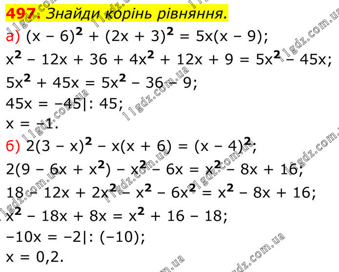 Знайди корінь рівняння. a) (x – 6)2 + (2x + 3)2 = 5x(x – 9); x2 – 12x + 36 + 4x2 + 12x + 9 = 5x2 – 45x; 5x2 + 45x = 5x2 – 36 – 9; 45x = –45|: 45; x = –1. б) 2(3 – x)2 – x(x + 6) = (x – 4)2; 2(9 – 6x + x2) – x2 – 6x = x2 – 8x + 16; 18 – 12x + 2x2 – x2 – 6x2 = x2 – 8x + 16; x2 – 18x + 8x = x2 + 16 – 18; –10x = –2|: (–10); x = 0,2.