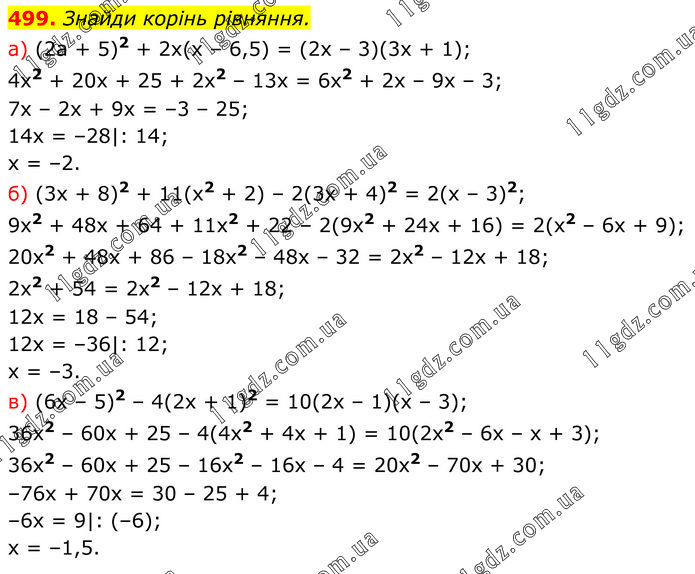Знайди корінь рівняння. a) (2a + 5)2 + 2x(x – 6,5) = (2x – 3)(3x + 1); 4x2 + 20x + 25 + 2x2 – 13x = 6x2 + 2x – 9x – 3; 7x – 2x + 9x = –3 – 25; 14x = –28|: 14; x = –2. б) (3x + 8)2 + 11(x2 + 2) – 2(3x + 4)2 = 2(x – 3)2; 9x2 + 48x + 64 + 11x2 + 22 – 2(9x2 + 24x + 16) = 2(x2 – 6x + 9); 20x2 + 48x + 86 – 18x2 – 48x – 32 = 2x2 – 12x + 18; 2x2 + 54 = 2x2 – 12x + 18; 12x = 18 – 54; 12x = –36|: 12; x = –3. в) (6x – 5)2 – 4(2x + 1)2 = 10(2x – 1)(x – 3); 36x2 – 60x + 25 – 4(4x2 + 4x + 1) = 10(2x2 – 6x – x + 3); 36x2 – 60x + 25 – 16x2 – 16x – 4 = 20x2 – 70x + 30; –76x + 70x = 30 – 25 + 4; –6x = 9|: (–6); x = –1,5.