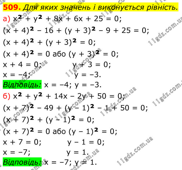 Для яких значень і виконується рівність. а) x² + y² + 8x + 6x + 25 = 0; (x + 4)² – 16 + (y + 3)² – 9 + 25 = 0; (x + 4)² + (y + 3)² = 0; (x + 4)² = 0 або (y + 3)² = 0; x + 4 = 0; y + 3 = 0; x = –4; y = –3. Відповідь: x = –4; y = –3. б) x² + y² + 14x – 2y + 50 = 0; (x + 7)² – 49 + (y – 1)² – 1 + 50 = 0; (x + 7)² + (y – 1)² = 0; (x + 7)² = 0 або (y – 1)² = 0; х + 7 = 0; у – 1 = 0; х = –7; у = 1. Відповідь: х = –7; у = 1.