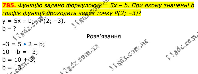 Функцію задано формулою у = 5х – b. При якому значенні b графік функції проходить через точку Р(2; –3)? y = 5x – b; P(2; –3). b – ? Розв’язання –3 = 5 • 2 – b; 10 – b = –3; b = 10 + 3; b = 13.