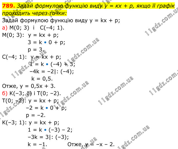 Задай формулою функцію виду у = кх + р, якщо її графік проходить через точки: Задай формулою функцію виду y = kx + p; a) M(0; 3) i C(–4; 1). M(0; 3): y = kx + p; 3 = k • 0 + p; p = 3. C(–4; 1): y = kx + p; 1 = k • (–4) + 3; –4k = –2|: (–4); k = 0,5. Отже, у = 0,5х + 3. б) K(–3; 1) i T(0; –2). T(0; –2): y = kx + p; –2 = k • 0 + p; p = –2. K(–3; 1): y = kx + p; 1 = k • (–3) – 2; –3k = 3|: (–3); k = –1. Отже, у = –х – 2.