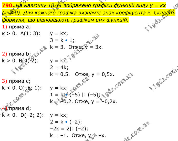 На малюнку 18.11 зображено графіки функцій виду у = кх (к ≠ 0). Для кожного графіка визначте знак коефіцієнта к. Складіть формули, що відповідають графікам цих функцій. 1) пряма а; к > 0. A(1; 3): y = kx; 3 = k • 1; k = 3. Отже, у = 3х. 2) пряма b; k > 0. B(4; 2): y = kx; 2 = 4k; k = 0,5. Отже, у = 0,5х. 3) пряма с; k < 0. C(–5; 1): y = kx; 1 = k • (–5) |: (–5); k = –0,2. Отже, у = –0,2х. 4) пряма d; k < 0. D(–2; 2): y = kx; 2 = k • (–2); –2k = 2|: (–2); k = –1. Отже, у = –х.