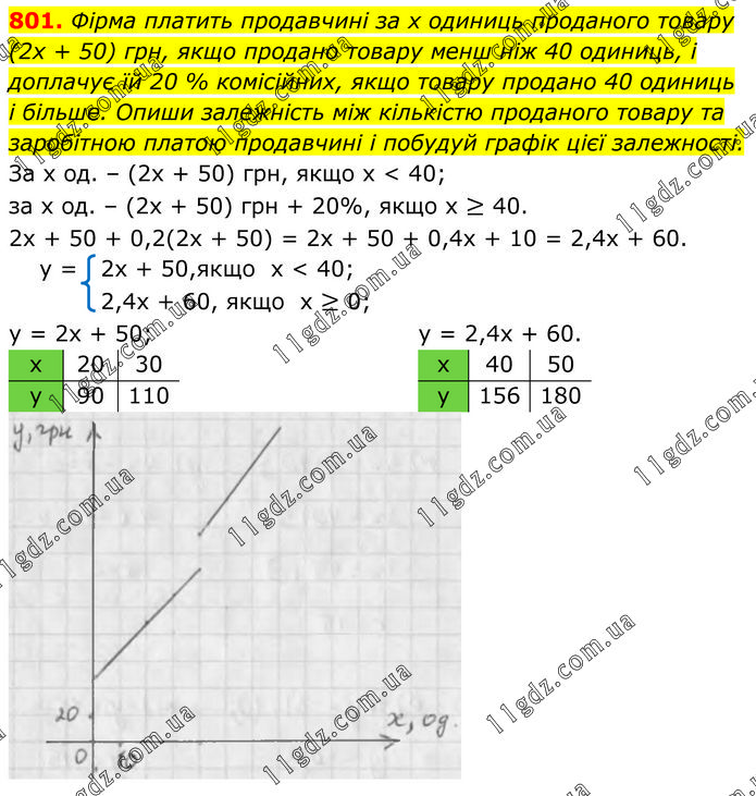 Фірма платить продавчині за х одиниць проданого товару (2х + 50) грн, якщо продано товару менш ніж 40 одиниць, і доплачує їй 20 % комісійних, якщо товару продано 40 одиниць і більше. Опиши залежність між кількістю проданого товару та заробітною платою продавчині і побудуй графік цієї залежності.