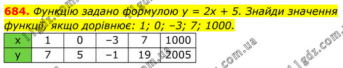 Функцію задано формулою у = 2х + 5. Знайди значення функції, якщо дорівнює: 1; 0; –3; 7; 1000.