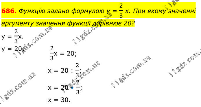 Функцію задано формулою у = 2/3 х. При якому значенні аргументу значення функції дорівнює 20? у = 2/3х. у = 20; 2/3х = 20; х = 20 : 2/3; х = 20 • 2/3; х = 30.
