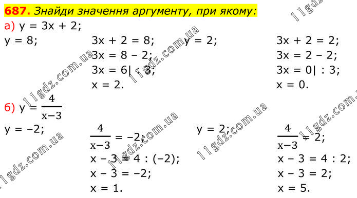 Знайди значення аргументу, при якому: а) y = 3x + 2; y = 8; 3x + 2 = 8; 3х = 8 – 2; 3х = 6| : 3; x = 2. y = 2; 3x + 2 = 2; 3x = 2 – 2; 3х = 0| : 3; x = 0. б) у = 4/(х-3) y = –2; 4/(х-3) = –2; x – 3 = 4 : (–2); x – 3 = –2; x = 1. y = 2; 4/(х-3) = 2; x – 3 = 4 : 2; x – 3 = 2; x = 5.