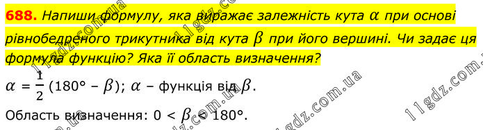 Напиши формулу, яка виражає залежність кута α при основі рівнобедреного трикутника від кута β при його вершині. Чи задає ця формула функцію? Яка її область визначення? α = 1/2 (180° – β); α – функція від β. Область визначення: 0 < β < 180°.