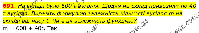 На складі було 600 т вугілля. Щодня на склад привозили по 40 т вугілля. Виразіть формулою залежність кількості вугілля m на складі від часу t. Чи є ця залежність функцією? m = 600 + 40t. Так.