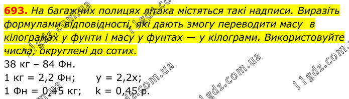 На багажних полицях літака містяться такі надписи. Виразіть формулами відповідності, які дають змогу переводити масу в кілограмах у фунти і масу у фунтах — у кілограми. Використовуйте числа, округлені до сотих. 38 кг – 84 Фн. 1 кг = 2,2 Фн; у = 2,2х; 1 Фн = 0,45 кг; k = 0,45 p.