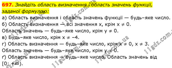 Знайдіть область визначення і область значень функції, заданої формулою: а) Область визначення і область значень функції — будь–яке число. б) Область визначення — всі значення х, крім х ≠ 0. Область значень — будь–яке число, крім у ≠ 0. в) Будь–яке число, крім х ≠ –4. г) Область визначення — будь–яке число, крім х ≠ 0, х ≠ 3. Область значень — будь–яке число, крім у ≠ 0. ґ) Область визначення — будь–яке число. Область значень від [0; +∞).