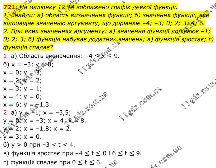 На малюнку 17.14 зображено графік деякої функції. 1. Знайди: а) область визначення функції; б) значення функції, яке відповідає значенню аргументу, що дорівнює –4; –3; 0; 2; 3; 4; 6. 2. При яких значеннях аргументу: а) значення функції дорівнює –1; 0; 2; 3; б) функція набуває додатних значень; в) функція зростає; г) функція спадає? 1. а) Область визначення: –4 ≤ x ≤ 9. б) x = –3; y = 0; x = 0; y = 3; x = 2; y = 2; x = 3; y = 1; x = 4; y = 0; x = 6; y = –1,3. 2. а) y = –1; x = –3,5; у = 0; x = –3; x = 4; x = 8. y = 2; x = –1,8; x = 2. y = 3; х = 0. б) у > 0 при –3 < t < 4. в) функція зростає при –4 ≤ t ≤ 0 і 6 ≤ t ≤ 9. г) функція спадає при 0 ≤ t ≤ 6.