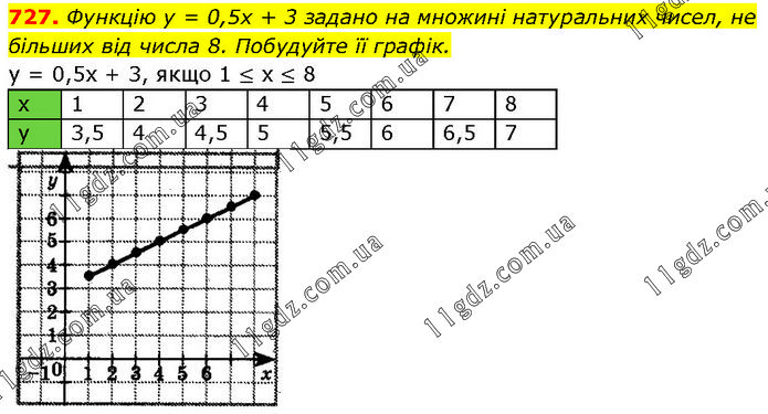 Функцію у = 0,5х + 3 задано на множині натуральних чисел, не більших від числа 8. Побудуйте її графік. у = 0,5x + 3, якщо 1 ≤ x ≤ 8