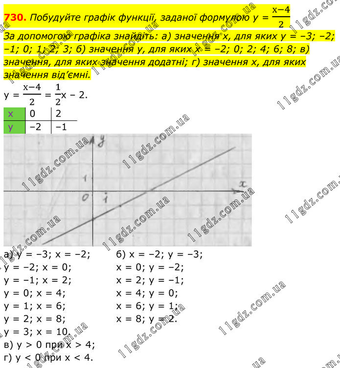Побудуйте графік функції, заданої формулою у = (х-4)/2 За допомогою графіка знайдіть: а) значення х, для яких у = –3; –2; –1; 0; 1; 2; 3; б) значення у, для яких х = –2; 0; 2; 4; 6; 8; в) значення, для яких значення додатні; г) значення х, для яких значення від’ємні. у = (х-4)/2 = 1/2х – 2. а) y = –3; x = –2; y = –2; x = 0; y = –1; x = 2; y = 0; x = 4; y = 1; x = 6; y = 2; x = 8; y = 3; х = 10. б) x = –2; y = –3; x = 0; y = –2; x = 2; y = –1; x = 4; y = 0; x = 6; y = 1; x = 8; y = 2. в) у > 0 при х > 4; г) у < 0 при х < 4.