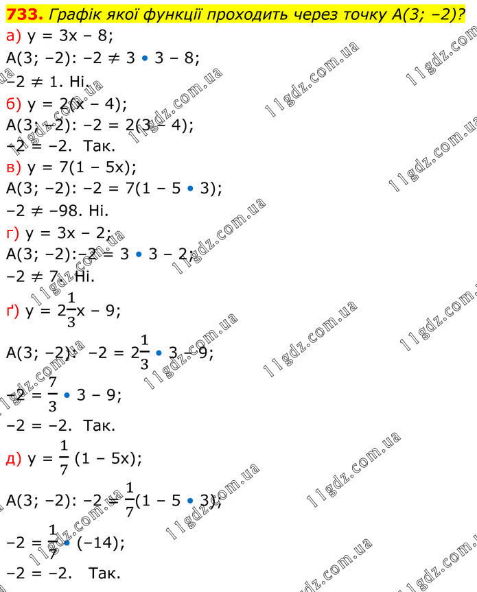 Графік якої функції проходить через точку A(3; –2)? а) у = 3х – 8; А(3; –2): –2 ≠ 3 • 3 – 8; –2 ≠ 1. Ні. б) y = 2(x – 4); А(3; –2): –2 = 2(3 – 4); –2 = –2. Так. в) y = 7(1 – 5x); А(3; –2): –2 = 7(1 – 5 • 3); –2 ≠ –98. Ні. г) y = 3x – 2; А(3; –2):–2 = 3 • 3 – 2; –2 ≠ 7. Ні. ґ) у = 21/3х – 9; А(3; –2): –2 = 21/3 • 3 – 9; –2 = 7/3 • 3 – 9; –2 = –2. Так. д) у = 1/7 (1 – 5х); А(3; –2): –2 = 1/7(1 – 5 • 3); –2 = 1/7 • (–14); –2 = –2. Так.
