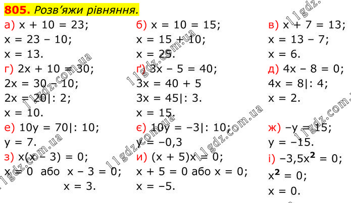 Розв’яжи рівняння. a) x + 10 = 23; x = 23 – 10; x = 13. б) x = 10 = 15; x = 15 + 10; x = 25. в) x + 7 = 13; x = 13 – 7; x = 6. г) 2x + 10 = 30; 2x = 30 – 10; 2x = 20|: 2; x = 10. ґ) 3x – 5 = 40; 3x = 40 + 5 3x = 45|: 3. x = 15. д) 4х – 8 = 0; 4x = 8|: 4; x = 2. е) 10y = 70|: 10; y = 7. є) 10y = –3|: 10; y = –0,3 ж) –y = 15; y = –15. з) х(х – 3) = 0; х = 0 або х – 3 = 0; х = 3. и) (х + 5)х = 0; х + 5 = 0 або х = 0; х = –5. і) –3,5х2 = 0; х2 = 0; х = 0.