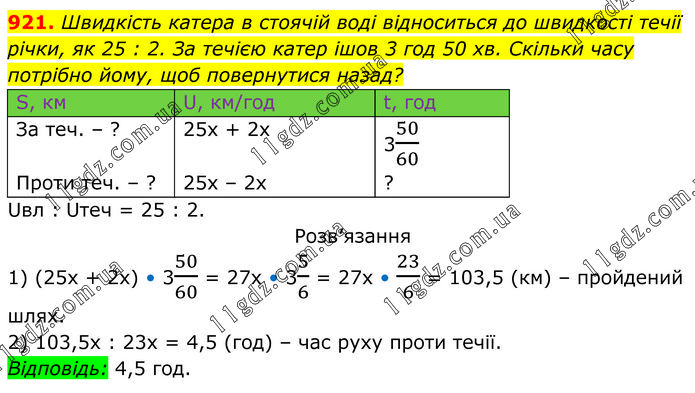 Швидкість катера в стоячій воді відноситься до швидкості течії річки, як 25 : 2. За течією катер ішов 3 год 50 хв. Скільки часу потрібно йому, щоб повернутися назад? Uвл : Uтеч = 25 : 2. Розв’язання 1) (25х + 2х) • 350/60 = 27х • 35/6 = 27х • 23/6 = 103,5 (км) – пройдений шлях. 2) 103,5х : 23х = 4,5 (год) – час руху проти течії. Відповідь: 4,5 год.