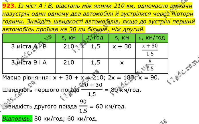 Із міст А і В, відстань між якими 210 км, одночасно виїхачи назустріч один одному два автомобілі й зустрілися через півтори години. Знайдіть швидкості автомобілів, якщо до зустрічі перший автомобіль проїхав на 30 км більше, ніж другий. Маємо рівняння: х + 30 + х = 210; 2х = 180; х = 90. Швидкість першого поїзда (90 + 30)/1,5 = 80 км/год. Швидкість другого поїзда 90/1,5 = 60 км/год. Відповідь: 80 км/год; 60 км/год.