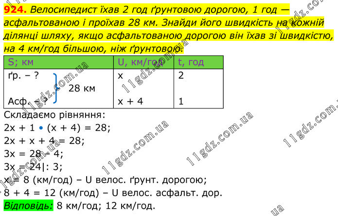 Велосипедист їхав 2 год ґрунтовою дорогою, 1 год — асфальтованою і проїхав 28 км. Знайди його швидкість на кожній ділянці шляху, якщо асфальтованою дорогою він їхав зі швидкістю, на 4 км/год більшою, ніж ґрунтовою. Складаємо рівняння: 2х + 1 • (х + 4) = 28; 2х + х + 4 = 28; 3х = 28 – 4; 3х = 24|: 3; х = 8 (км/год) – U велос. ґрунт. дорогою; 8 + 4 = 12 (км/год) – U велос. асфальт. дор. Відповідь: 8 км/год; 12 км/год.