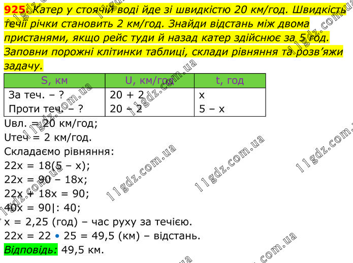Катер у стоячій воді йде зі швидкістю 20 км/год. Швидкість течії річки становить 2 км/год. Знайди відстань між двома пристанями, якщо рейс туди й назад катер здійснює за 5 год. Заповни порожні клітинки таблиці, склади рівняння та розв’яжи задачу. Uвл. = 20 км/год; Uтеч = 2 км/год. Складаємо рівняння: 22х = 18(5 – х); 22х = 90 – 18х; 22х + 18х = 90; 40х = 90|: 40; х = 2,25 (год) – час руху за течією. 22х = 22 • 25 = 49,5 (км) – відстань. Відповідь: 49,5 км.