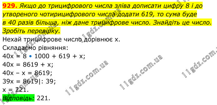 Якщо до трицифрового числа зліва дописати цифру 8 і до утвореного чотирицифрового числа додати 619, то сума буде в 40 разів більша, ніж дане трицифрове число. Знайдіть це число. Зробіть перевірку. Нехай трицифрове число дорівнює х. Складаємо рівняння: 40х = 8 • 1000 + 619 + х; 40х = 8619 + х; 40х – х = 8619; 39х = 8619|: 39; x = 221. Відповідь: 221.