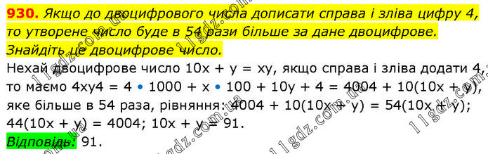 Якщо до двоцифрового числа дописати справа і зліва цифру 4, то утворене число буде в 54 рази більше за дане двоцифрове. Знайдіть це двоцифрове число. Нехай двоцифрове число 10х + у = ху, якщо справа і зліва додати 4, то маємо 4хy4 = 4 • 1000 + х • 100 + 10y + 4 = 4004 + 10(10х + у), яке більше в 54 раза, рівняння: 4004 + 10(10х + у) = 54(10х + у); 44(10х + у) = 4004; 10x + y = 91. Відповідь: 91.