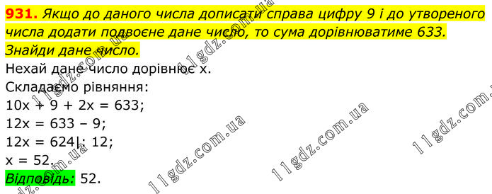 Якщо до даного числа дописати справа цифру 9 і до утвореного числа додати подвоєне дане число, то сума дорівнюватиме 633. Знайди дане число. Нехай дане число дорівнює х. Складаємо рівняння: 10х + 9 + 2х = 633; 12х = 633 – 9; 12х = 624|: 12; х = 52. Відповідь: 52.