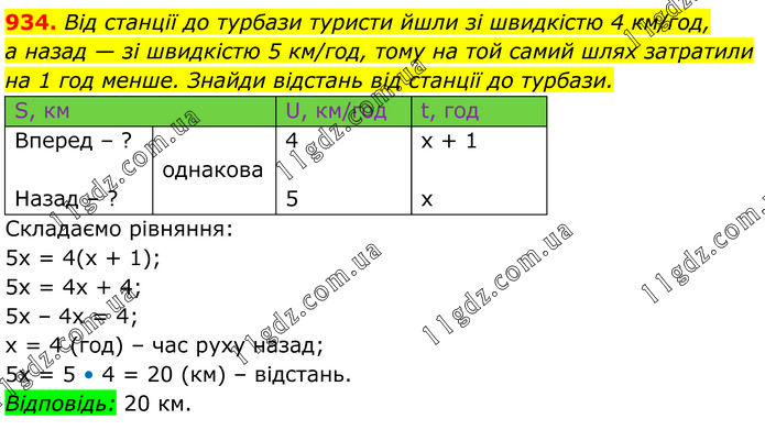 Від станції до турбази туристи йшли зі швидкістю 4 км/год, а назад — зі швидкістю 5 км/год, тому на той самий шлях затратили на 1 год менше. Знайди відстань від станції до турбази. Складаємо рівняння: 5х = 4(х + 1); 5х = 4х + 4; 5х – 4х = 4; х = 4 (год) – час руху назад; 5х = 5 • 4 = 20 (км) – відстань. Відповідь: 20 км.