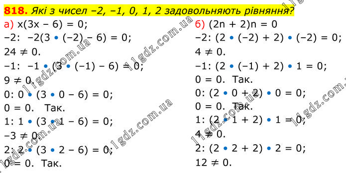 Які з чисел –2, –1, 0, 1, 2 задовольняють рівняння? а) x(3x – 6) = 0; –2: –2(3 • (–2) – 6) = 0; 24 ≠ 0. –1: –1 • (3 • (–1) – 6) = 0; 9 ≠ 0. 0: 0 • (3 • 0 – 6) = 0; 0 = 0. Так. 1: 1 • (3 • 1 – 6) = 0; –3 ≠ 0. 2: 2 • (3 • 2 – 6) = 0; 0 = 0. Так. б) (2n + 2)n = 0 –2: (2 • (–2) + 2) • (–2) = 0; 4 ≠ 0. –1: (2 • (–1) + 2) • 1 = 0; 0 = 0. Так. 0: (2 • 0 + 2) • 0 = 0; 0 = 0. Так. 1: (2 • 1 + 2) • 1 = 0; 4 ≠ 0. 2: (2 • 2 + 2) • 2 = 0; 12 ≠ 0.