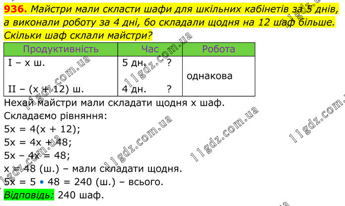 Майстри мали скласти шафи для шкільних кабінетів за 5 днів, а виконали роботу за 4 дні, бо складали щодня на 12 шаф більше. Скільки шаф склали майстри? Нехай майстри мали складати щодня х шаф. Складаємо рівняння: 5х = 4(х + 12); 5х = 4х + 48; 5х – 4х = 48; х = 48 (ш.) – мали складати щодня. 5х = 5 • 48 = 240 (ш.) – всього. Відповідь: 240 шаф.