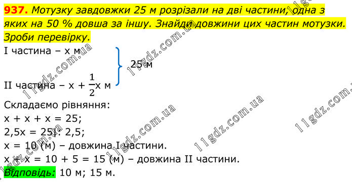 Мотузку завдовжки 25 м розрізали на дві частини, одна з яких на 50 % довша за іншу. Знайди довжини цих частин мотузки. Зроби перевірку. І частина – х м 25 м ІІ частина – х + 1/2х м Складаємо рівняння: х + х + х = 25; 2,5х = 25|: 2,5; х = 10 (м) – довжина І частини. х + х = 10 + 5 = 15 (м) – довжина ІІ частини. Відповідь: 10 м; 15 м.